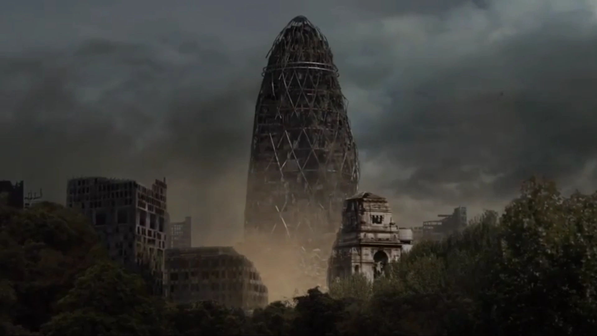 100 years after people, the Gherkin is covered in vegetation, and the building is being stripped away. Gordon Masterton stated that the individual glazing panels will begin to fall out of the external skin as the effects of wind, sun, and rain have an aggravating effect on the condition of the materials of the building.