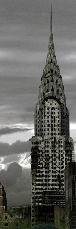 New York silhouette is a throwback to the Great Depression when the modern skyscrapers collapse due to its lightweight protection. In the 1930s, the Empire State Building and the Chrysler Building race to be the tallest buildings in the world. The Chrysler Building held the crown for less than a year before being surpassed by the Empire State Building. 200 years without maintenance, the Empire State Building slips from the skyline, the tallest building in New York City collapse. The Chrysler Building is once again the tallest building in New York City, but it's reign won't last long. The columns of the building have been deteriorating, which no longer support the floors. Gordon Masterton stated that when several columns buckles, a single floor collapse and the rest follow, causing a cascading collapse. The Chrysler Building, the first skyscrapers to stand taller than 100 feet, collapse as the floors crumbles from one another triggering a cascading collapse.